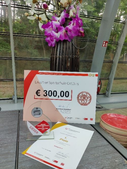 Das Deutsche Sportabzeichen hat sich weiter im Sportland Brandenburg etabliert und 2023 mehr Brandenburgerinnen und Brandenburger in seinen Bann gezogen als in den Jahren zuvor. Einen großen Anteil an dieser positiven Entwicklung haben die „Sparkassen Sportabzeichenwettbewerbe“, deren 2023-Sieger in den Kategorien „Schule“ und „Kreis-und Stadtsportbünde (KSB/SSB)“ und „Vereine“ am 04.06.2023 im Congress Center des Tropical Islands in Brand ausgezeichnet wurden. Während der zentralen Auszeichnungsveranstaltung bekamen die jeweils drei Erstplatzierten der unterschiedlichen Wertungsklassen Pokale und Prämien, bevor das Tropical Islands mit all seinen Attraktionen den Schülerinnen und Schülern der siegreichen Schulen für einen Entdeckungstrip offenstand. Für die Lausitzer Sportschule nahmen die Schülerinnen Julie Kempe, Kira Vorobiova und Schüler Valerii Titov sowie Oberstufenkoordinator Steffen Böhme und Sportkoordinator Swen Szymanski die Ehrung entgegen.